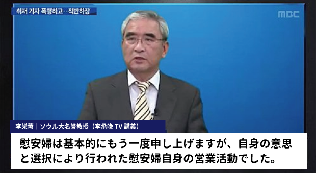 李栄薫教授は、日本軍慰安婦について、日帝時代に合法的に運用された公娼制度を日本軍が軍施設に指定したものだと説明し、いわゆる性奴隷説を否定した。