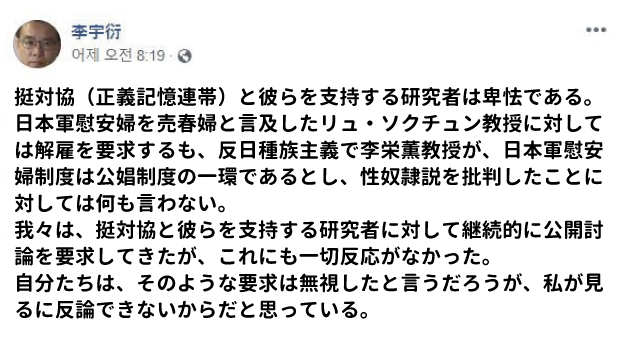 李栄薫教授が公開討論を申し込むと巣穴に隠れる挺対協