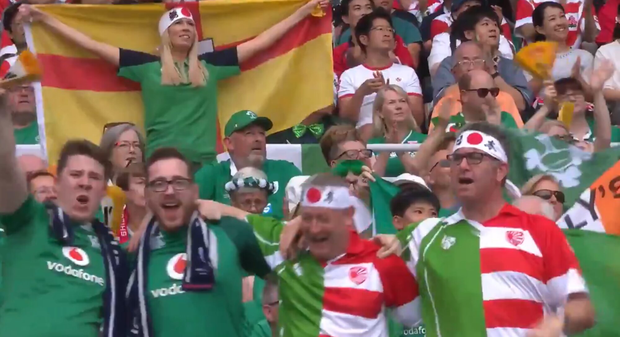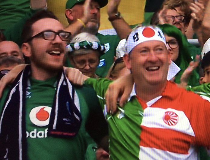 アイルランド人が日に丸鉢巻で、多分アイルランドを応援している。