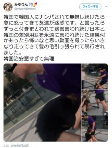 動画は暴行された23日に公開された。路上で男が撮影者の女性を追い回し、「チョッパリ」(日本人の蔑称)と連呼する姿が映っていた。また、男が倒れた女性の髪の毛をつかんでいる場面もある。