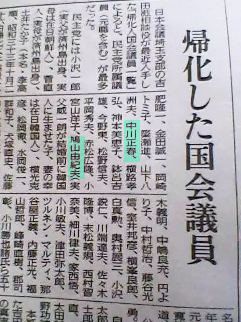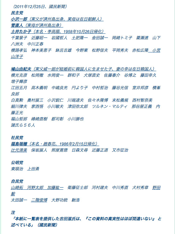 (2011年12月25日、國民新聞) 発行の 帰化人国会議員一覧 によると
