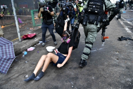 香港警察が工科大鎮圧… 引きずられるデモ女性-香港人デモ隊が民主化闘争の「最後の砦」と見なした同工科大学に対する警察の鎮圧作戦が開始された18日、ある女性が校庭を脱出しようとして警察に捕まり、連行されている。 警察がデモ隊に向かって数回実弾を発射するなど香港事態がますます悪化すると、香港教育当局は今月14日に開始した休校令を19日まで延長した。 (香港AFP連合ニュース)