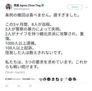 8名無し2019/10/01(Tue) 19:22:38ID:I3NTQzNw=(1/2)NG報告この3カ月で周庭さん達の仲間、8人が自殺。3人が失明。2人が重傷だ。インドネシア人の記者も巻き込まれてる中国共産党の恐ろしさだよ香港警察は、笑いながら、暴行してる>>43>>3199