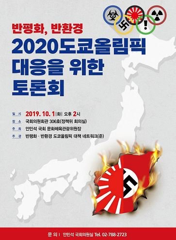 韓国与党議員「東京五輪対応討論会」開催 旭日旗とハーケンクロイツを燃やすポスター作成