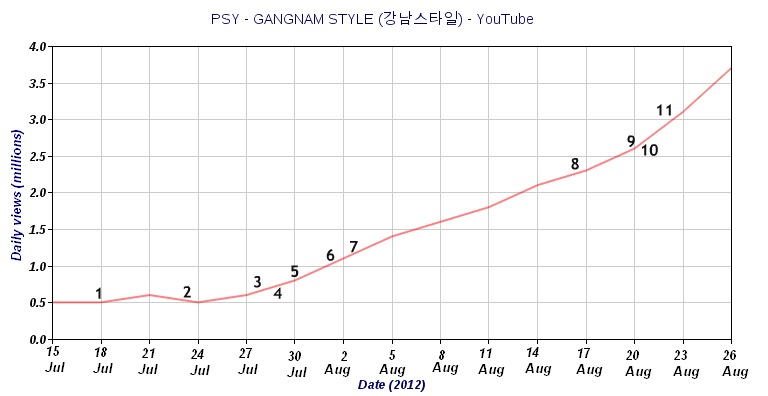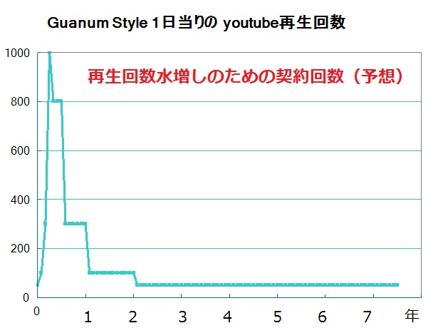 カンナム・スタイルの再生工作が一段落した3年目以降、1日50万回再生の契約が続いていると考えると、累計再生回数の推移からして、大体計算が合っているよ。