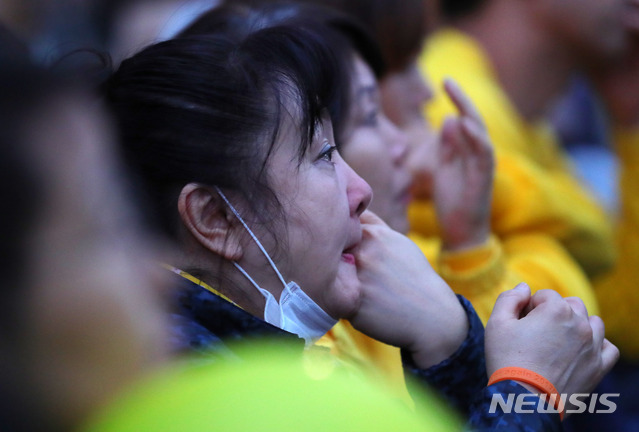 【ソウル=ニューシス】ベフンシク記者= 6日午後、ソウル鍾路区光化門広場で開かれた年月号惨事2000日の記憶文化祭に参加した遺族などが過去の映像を見て悲しみにロックされている。2019.10.06。