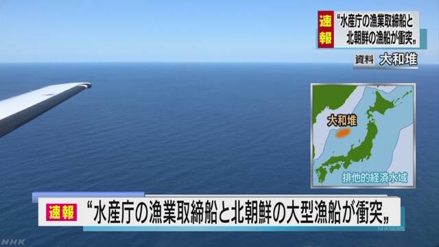 海上保安庁によりますと午前9時10分ごろ、水産庁から「石川県の能登半島の北西、およそ350キロの沖合で水産庁の漁業取締船と北朝鮮の大型の漁船が衝突した」と連絡が入ったということです。