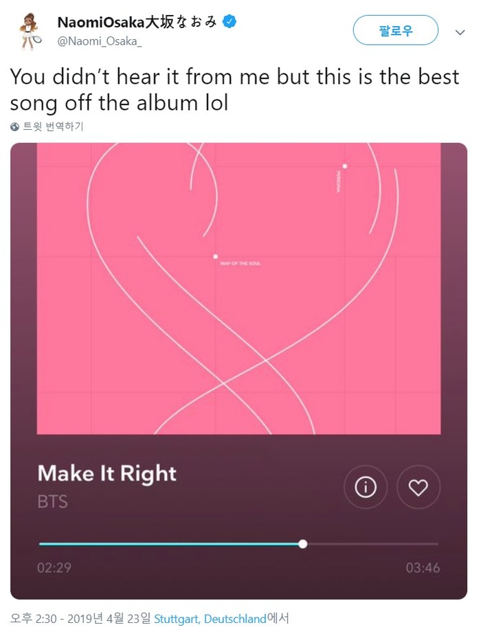 실제로 오사카는 지난 4월 방탄소년단의 신곡을 듣는 핸드폰 화면을 캡처해 트위터에 올리며 “이전까지 들어본 적 없는, 이번 앨범 최고의 노래”라며 애정을 보인 바 있다.