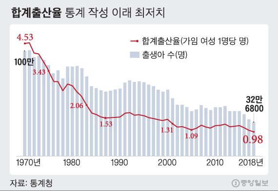 注目すべき点は、合計特殊出生率(女性1人が産むと予想される平均出生児数)である。昨年合計特殊出生率は0.98人で、年間ベース史上初めて0人台進入した。これは出生統計を始めた1970年以来の低水準であり、年間ベースで出生率が1人の下に下がったのも初めてだ。