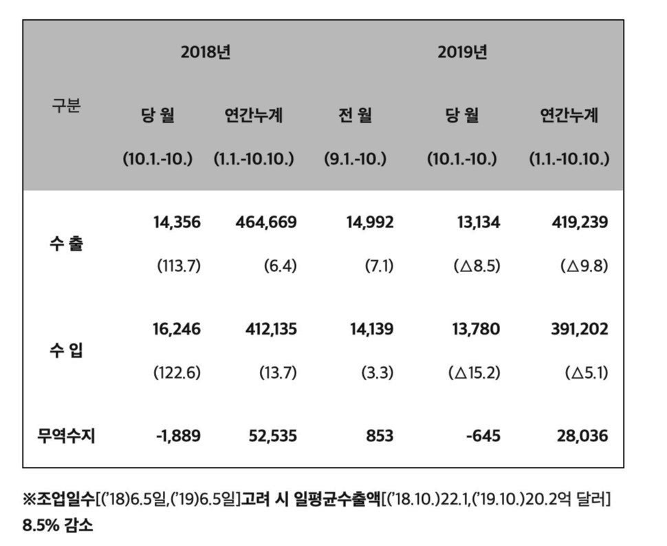 11日、関税庁によると、今月1~10日の輸出は131億ドルで、1年前の同じ期間より8.5%減少した。操業日数は6.5日で、昨年と同じである。月間輸出額は昨年12月から先月まで10ヶ月連続減少している。