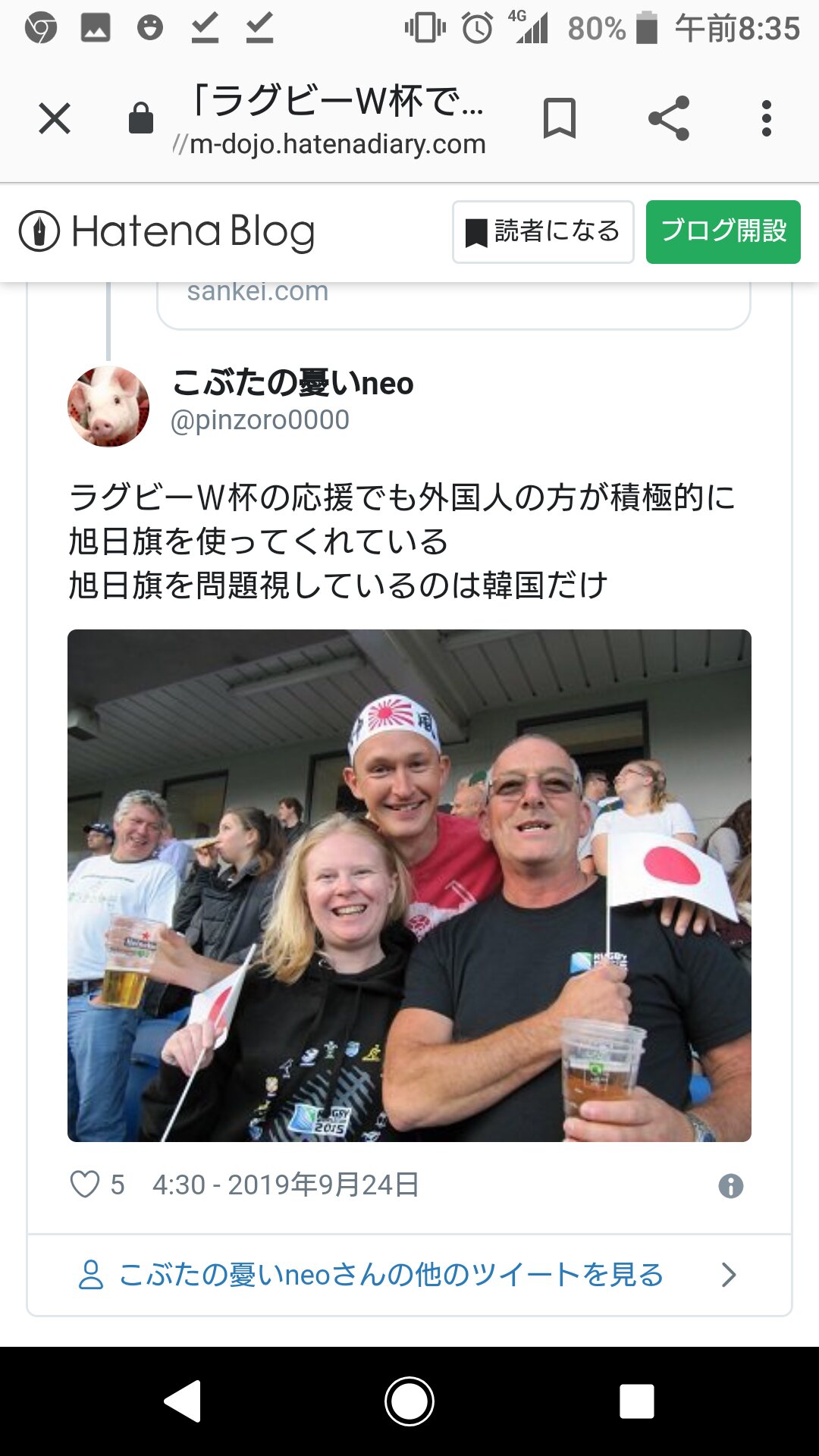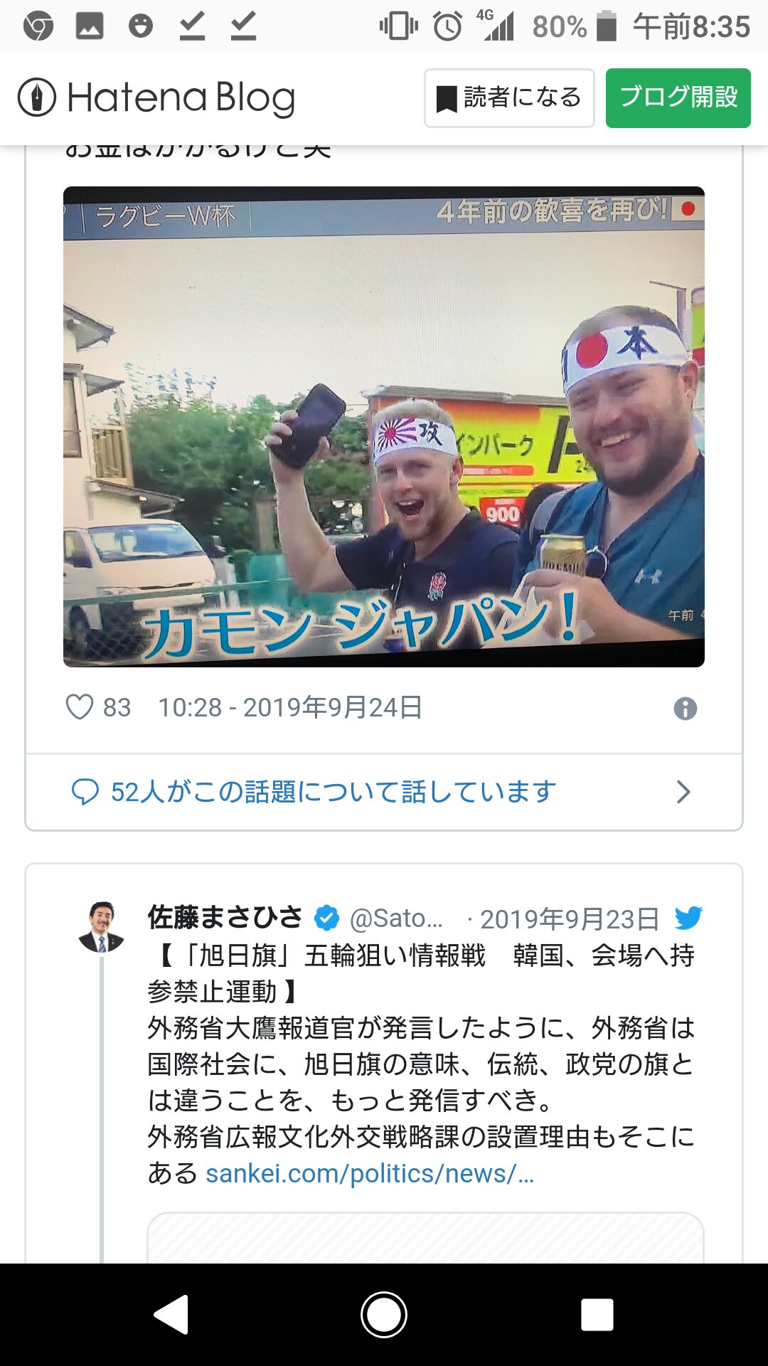 1名無し2019/10/13(Sun) 04:50:27ID:Y4ODE4MzY(1/2)NG報告何処の会場でも此の姿をよく目にする。韓国では在り得ない光景。>>2>>3>>802名無し2019/10/13(Sun) 05:50:21ID:AwNTQ0NDk(1/1)NG報告>>1別に韓国と比べる気はないけど、ホスト国としては楽しんでもらえてるのは純粋に嬉しいよね。天災の多い国で申し訳ない>>4>>533名無し2019/10/13(Sun) 07:27:50ID:gyMDA3MjA(1/1)NG報告◆ハチマキwiki鉢巻(はちまき)とは、主に日本において精神の統一や気合の向上のために用いられる、頭に付ける細長い布あるいは紐である。韓国のハチマキは日帝残滓じゃないのか?バンダナとか言い訳しそうだがww>>1象徴すべき文化アイテムが下朝鮮には無いしね。キムチを頭に巻けば異臭騒動が起こるだろうなw04名無し2019/10/13(Sun) 07:32:00ID:I5NTI2NTA(1/1)NG報告今日はスコットランド戦ですね。勝てるといいなあ。頑張れ日本!>>2まさか開催中に大型台風が来るなんてね。ホント申し訳ないです。>>505名無し2019/10/13(Sun) 07:38:16ID:Y4ODE4MzY(2/2)NG報告>>2>>4その通りで各国には申し訳ないよなぁ天災に関する事項は協定書には書かれてるらしいけど、中止ドローになったイングランドとフランスは無観客試合で構わないから再試合をやりたがってるね。イタリアもニュージーランドにジャイアントキリングを起こして決勝リーグに行きたかったんだろうね。>>616猛獣使い2019/10/13(Sun) 07:41:45ID:E0Njk1ODQ(1/1)NG報告>>5規定とはいえ、実際に中止になれば批判は起きるわな。だけど今日の釜石の昼の試合を夜にずらすくらいは出来るんじゃないかとは思う。何れにせよケチが付いたわ。07名無し2019/10/13(Sun) 08:28:12ID:c0ODUwMjc(1/1)NG報告やはりスポーツは秋がいいな五輪も秋にやれっつーの18脱亜論2019/10/13(Sun) 14:09:52ID:I3MDk2ODQ(1/1)NG報告>>1つまらん。こっちを貼るべきだ。09 2019/10/13(Sun) 14:21:21ID:AyNjAwODc(1/1)NG報告この時期に関東と東北を襲う台風が来るなど誰もイメージできないよ俺は九州育ちだから解る0