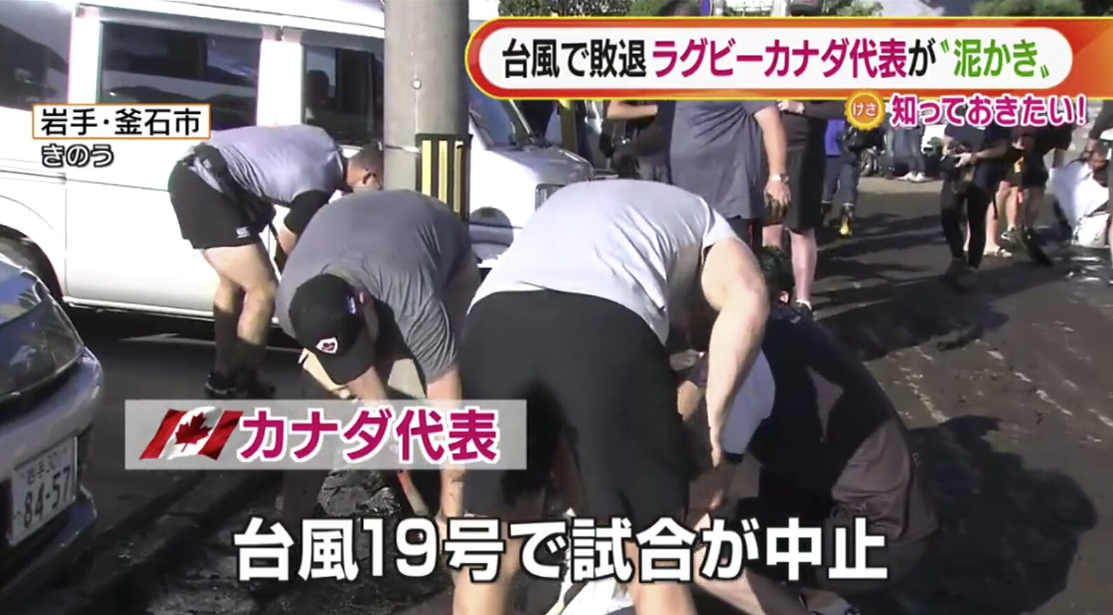 台風の影響で中止になったラグビーワールドカップの岩手県釜石市での試合に出場予定だったカナダ代表の選手たちが、これまでの応援などに対する感謝を示そうと、道路にたまった土砂などを片づける清掃ボランティアに参加しました。