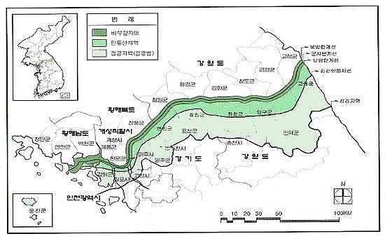 ・緑色:民統線(韓国側、非武装地帯からの距離5km~10㎞)