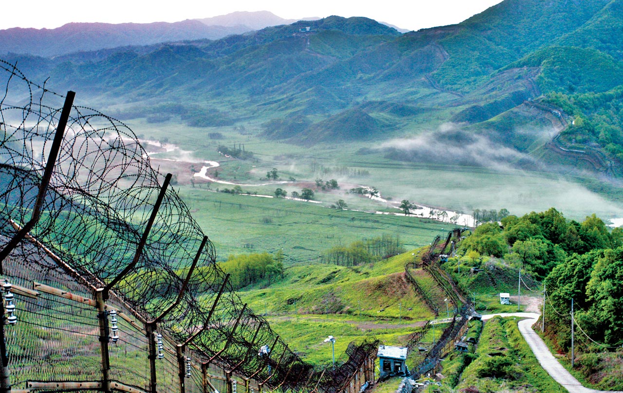 ・GOP鉄柵 国境警備隊が哨戒する小道、3重の鉄条網