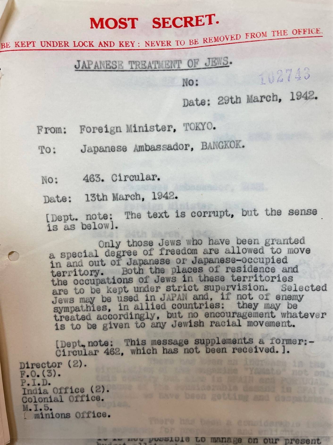 確認されたのは同月29日にタイの首都バンコクの日本大使、31日に北部仏印のハノイの日本大使にそれぞれ宛てた公電。外務省が「対策」を占領地の在外公館に伝えたのを傍受したもので、英暗号解読拠点「ブレッチリー・パーク」が解読。最高機密文書として英訳され、英国立公文書館が「日本のユダヤ人政策」として保管していた。