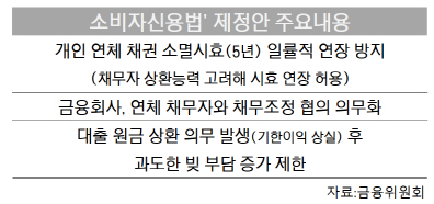 <消費者信用法は、銀行が貸してくれた信用貸付・担保融資など個人債権の消滅時効(元金延滞の日から5年)が経過すると、金融会社が融資を取り戻すの法的権利を放棄することにし、借り手が借金返済能力がある場合にのみ時効延長を許可するということが核心である>というものです。返す能力が無い(ようにしておく)と、5年経てば借金は返さずにすむ、というものです。