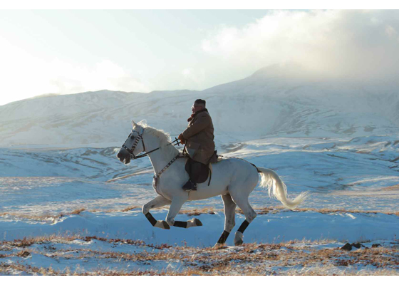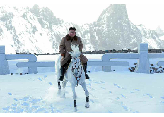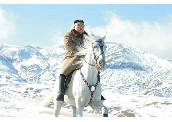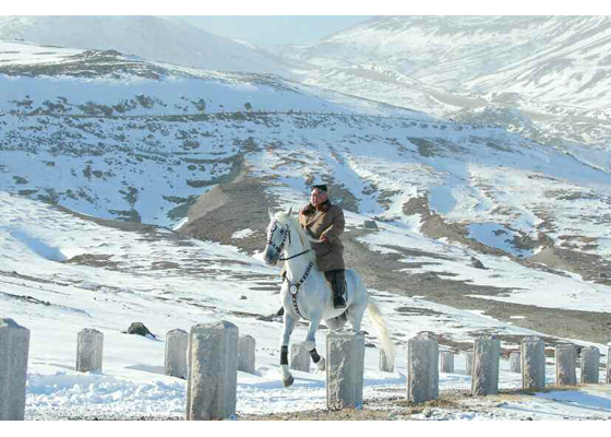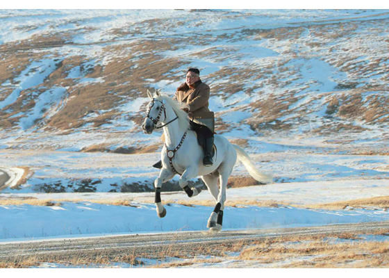 金正恩様、白馬に乗って白頭山を駆ける