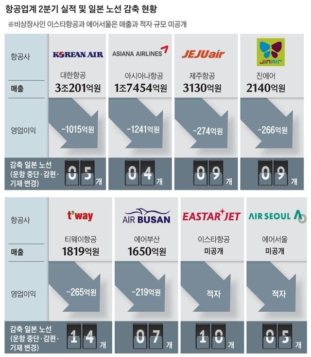 그러면 일본을 가는 한국인 관광객들이 줄어서 실제로 피해를 본 곳은 어딜까? 바보같게도 한국의 항공사들이다. 다음의 표는 한국의 항공사들의 영업이익이 대폭 감소했다는걸 증명한다... 한국어로 된 표라 일본인들은 일지 못하겠지만 - 표시가 붙어있는것만 봐도 대충 알겠지?