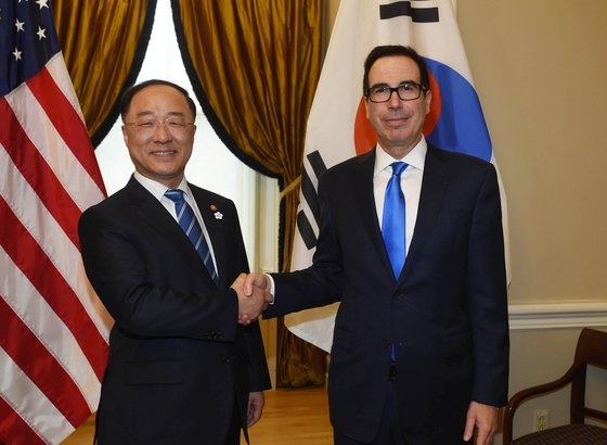 洪副首相は17日(現地時間)、主要20カ国・地域(G20)財務相・中央銀行総裁会議への出席のために訪れたワシントンDCでムニューシン財務長官と会談した。洪副首相就任後、3回目の会談となる。