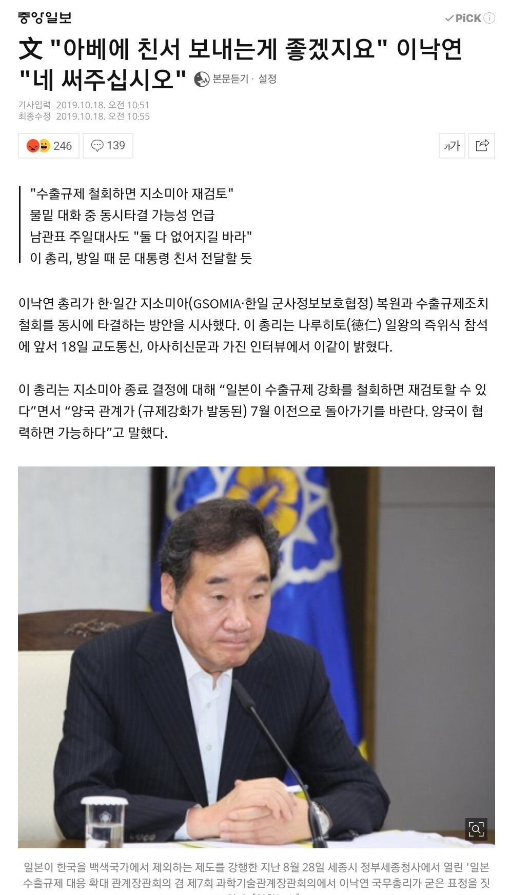 이낙연 총리가 한·일간 지소미아(GSOMIA·한일 군사정보보호협정) 복원과 수출규제조치 철회를 동시에 타결하는 방안을 시사했다. 이 총리는 나루히토(徳仁) 일왕의 즉위식 참석에 앞서 18일 교도통신, 아사히신문과 가진 인터뷰에서 이같이 밝혔다.