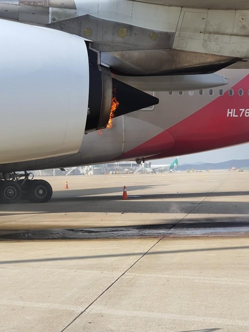 18日、アシアナ航空と乗客によると、この日の午後2時48分頃、仁川空港ターミナル1から米国ロサンゼルス(LA)で覆い出発の準備をしていたOZ202便(A380)旅客機のエンジンで火災が発生した。