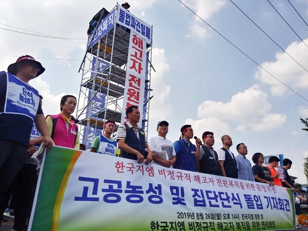 韓国GM非正規職労組は韓国GM群山工場の閉鎖と制縮小などで解雇された非正規職労働者46人全員の復職を求めている。これ去る8月25日から仁川富平チョンチョンドン本社正門前9mの高さの鉄塔を設置し、解雇者の代表的なイ・ヨンス議員などが上がって無期限高空籠城を行っている。座り込みは20日57日目を迎えた。また、イ・インファ民主労総仁川本部長は、1日から断食している。
