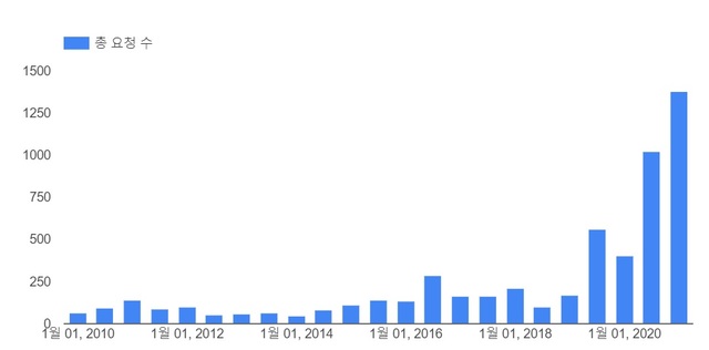 이명박 정부 시절 정부가 구글에 콘텐츠 삭제를 요청한 건수는 연평균 200건이 안 됐고, 박근혜 정부에서도 연평균 300건을 넘지 않았다.