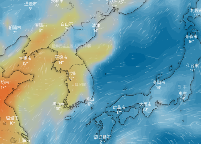 台風は熱帯低気圧の一種、低気圧だから大気を吸い込むの、吸い込む低気圧が日本に来たら中国の大気が朝鮮側に来るだろう。