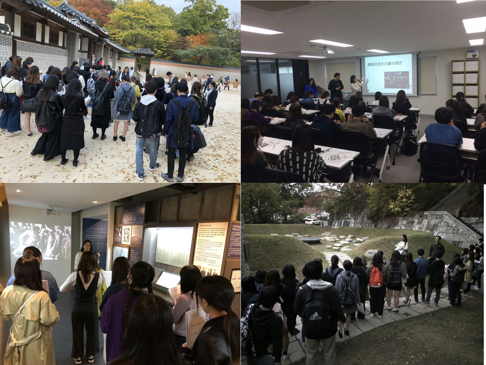 一日目・二日目は、景福宮や南山公園など、有名な観光地がもつ歴史的背景について、民族問題研究所の野木香里さんからの解説を受けながら、フィールドワークをおこないました。また、植民地歴史博物館を訪れ、『韓国のレジスタンス』の著者である趙漢成さんからの講義を聞きました。