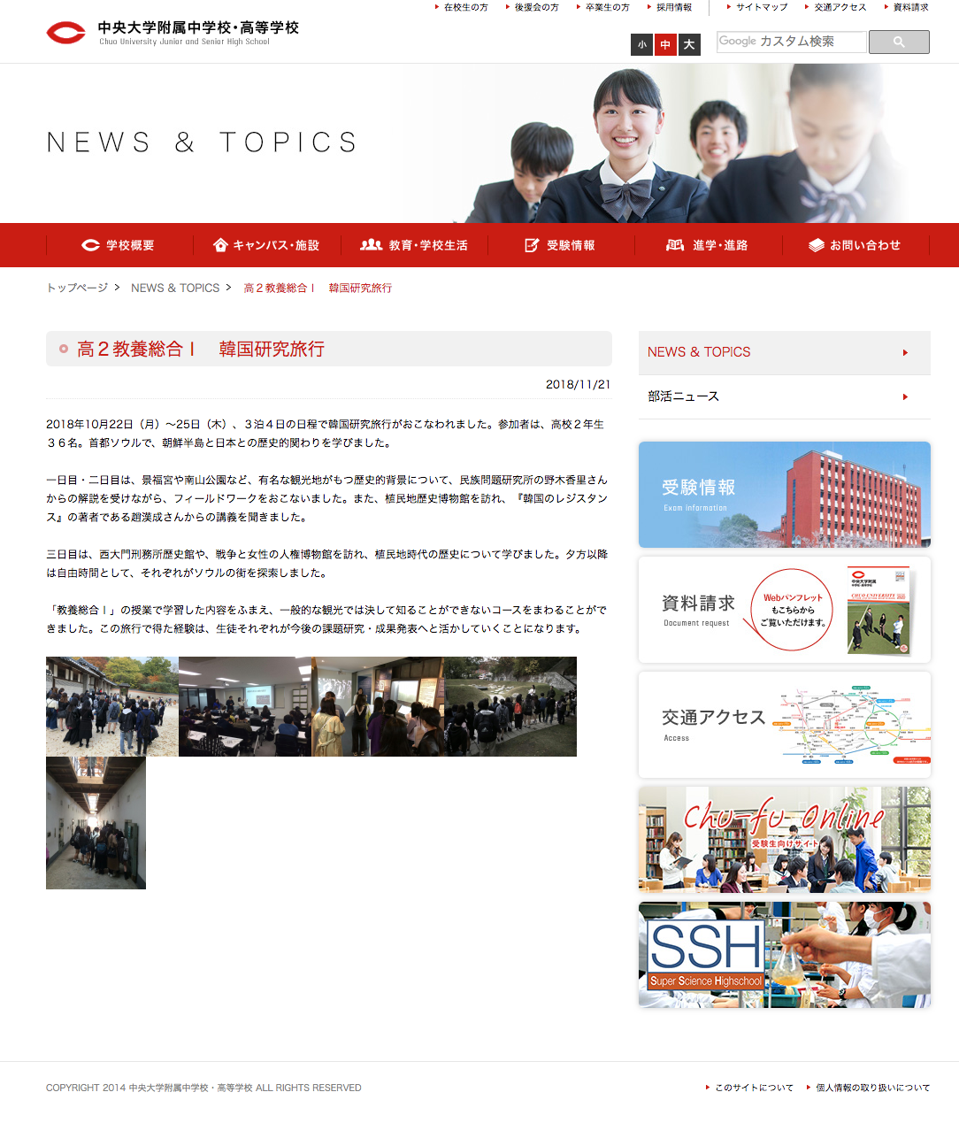 2018年10月22日(月)~25日(木)、3泊4日の日程で韓国研究旅行がおこなわれました。参加者は、高校2年生36名。首都ソウルで、朝鮮半島と日本との歴史的関わりを学びました。