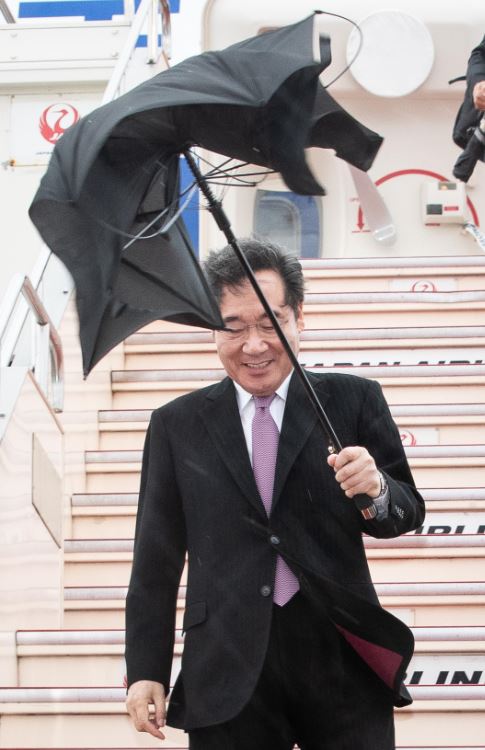 日王即位式参加のため2泊3日の訪日の途についたイ・ナギョン首相は去る22日、羽田空港に到着した。現場では強い風雨が吹いていた。イ・ナギョン首相がタラップを降りる時、強風のために傘がひっくり返りすぐ折れた。結局、イ首相は雨の滴を直接あびなければならなかった。