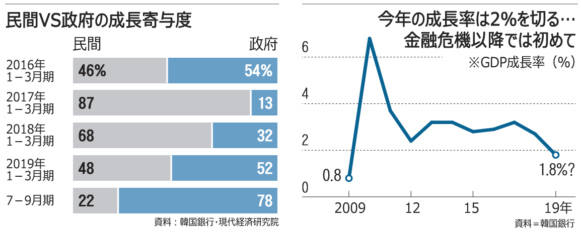 韓国経済が今年7-9月期に0.4%の成長にとどまり、今年の成長率2%達成は事実上、難しくなった。政府は財政をつぎ込んで景気浮揚に乗り出したものの、凍り付いた民間投資や消費不振をよみがえらせるには力が足りなかった。