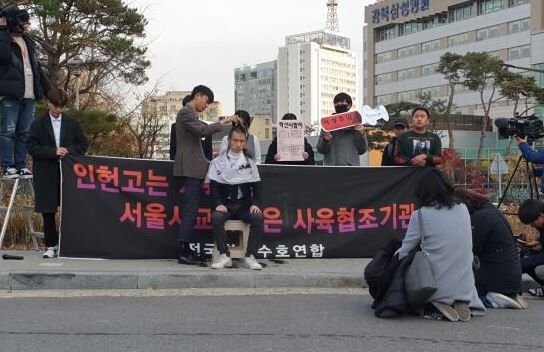 韓国の反応仁憲在学生が主軸になって作った全国学生守護連合(全国学スヨン)は23日午後3時、ソウル市教育庁前で緊急記者会見を開き、断髪式を行った。