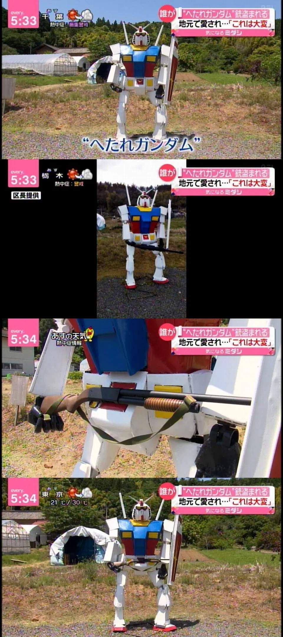 福島市平石にある鉄製のガンダム像「へたれガンダム」のビームライフルが盗まれていた事件で、地元住民が9日、なくなったビームライフルに代わり、像の手の部分にプラスチック製のモデルガンが置いてあるのを見つけた。