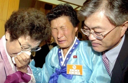 2004年7月11日、金剛山オンジョンガクで開かれた第10回離散家族再会行事でムン・ジェイン当時大統領府市民社会首席が母ガンハンオク(左)さんと一緒に、北側の叔母ガンビョンオク(中央)さんに会っている。韓国ネットでは自業自得と批判的コメントが多い!