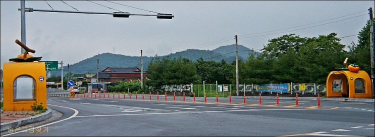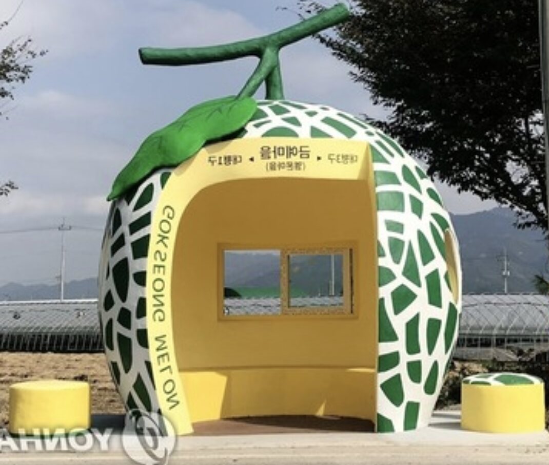 谷城郡は、日本の施設を参考にしただけで盗作ではない立場です。メロン特有のネット柄が鮮やかな施設。谷城の特産物であるメロンの知らせるために村の入口に立てたバス乗り場です。