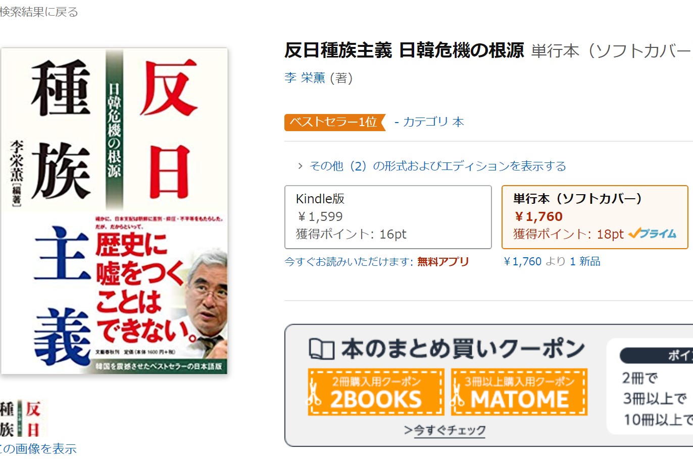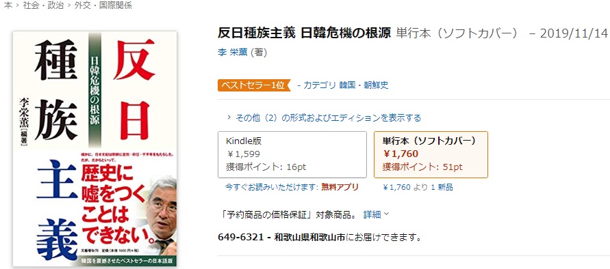 反日種族主義、アマゾンでベストセラー1位