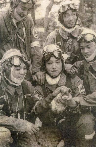下の写真、この2時間後には全員、死が迫っているというのに、子犬を抱き、撫でている17~18才の少年兵。楽しそうに仲間のハチマキを締め、明るく歌を唄ったり…と、映像や写真の中の先人達はみんな笑顔なんです。物凄く恐いはずなのに。