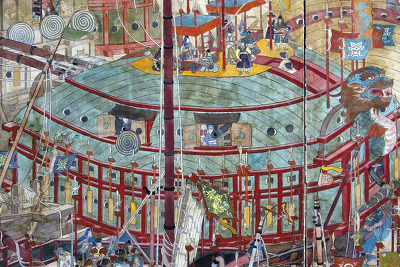 そして、その絵は日本の江戸で書かれたハズ。일본의 기함 안택선 아타케부네는 뱃머리 쪽에 1~2문, 좌우 각 1문 정도 장착하는 것이 고작이었다.