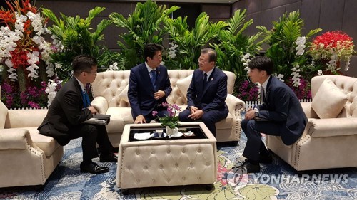 アセアン関連首脳会議に出席するため、タイのバンコクを訪問中のドア大統領はこの日午前(現地時間)、アセアン+3首脳会議が開かれたノボテルバンコクインパクトの上待機場で安倍首相と単独歓談をしたゴミンジョン大統領府報道官が書面ブリーフィングで伝えた。