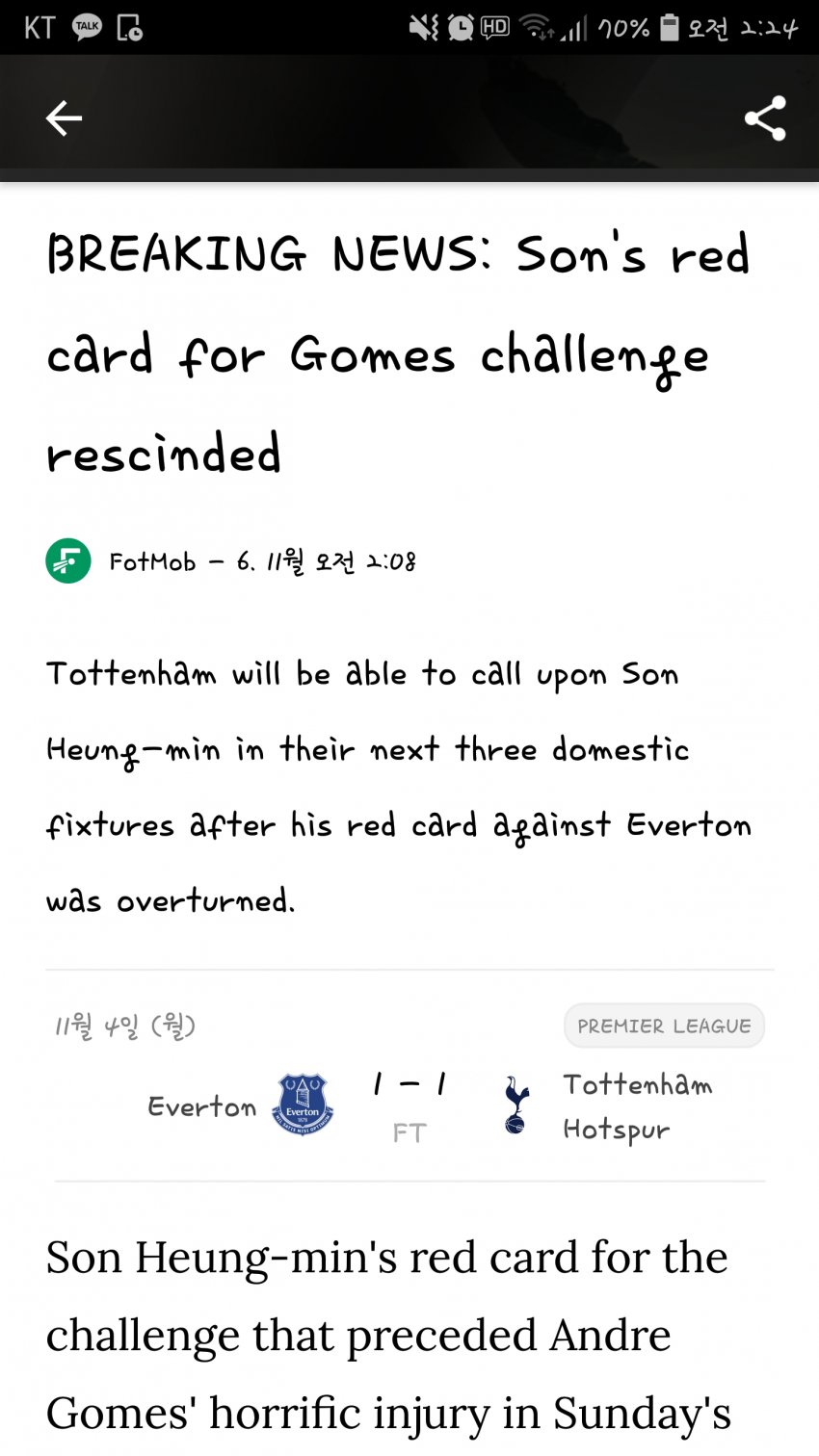 에버튼 감독- son의 부상목적 고의적 태클이 절대 아니였다 이것은 100% 확신한다