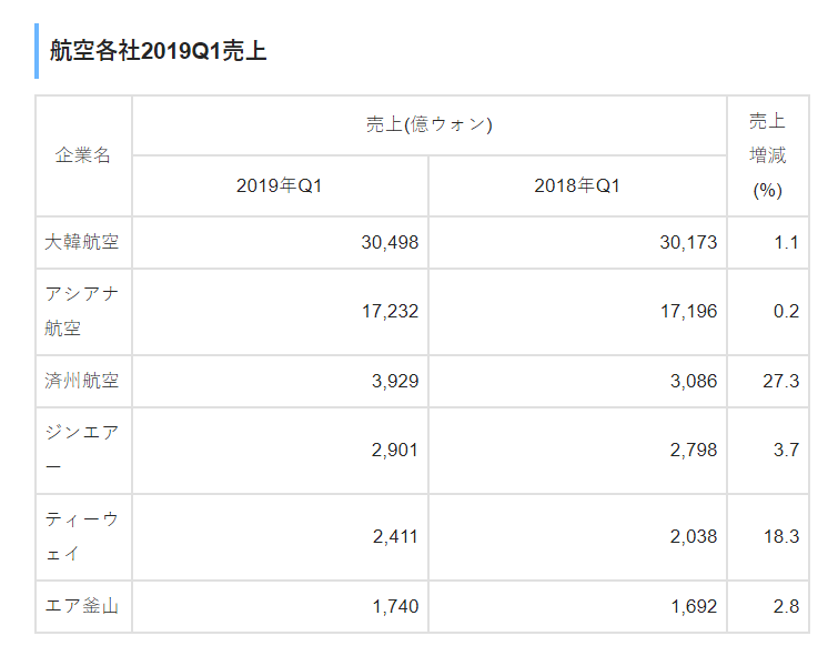 ちなみに、下図が韓国航空業界の第1四半期の売上