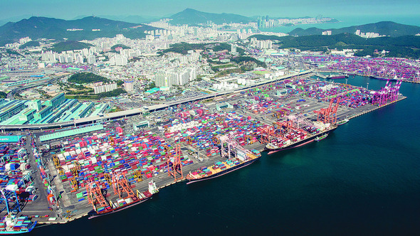 輸出用コンテナがずらりと並んだ釜山港湾の様子=ハンギョレ資料写真//ハンギョレ新聞社修正テープですかね