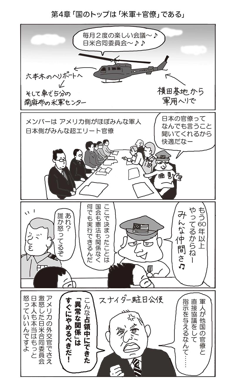 矢部: 外務省がまったく協力してくれなかったと石原さんは記者会見で言っていましたけど、合同委員会の実態を見ると、外務省が交渉してどうこうなるっていう話ではないんですよね。要するに、合同委員会で米軍側が決めたら、日本側はそれを聞き入れるしかないという関係なんですよ。