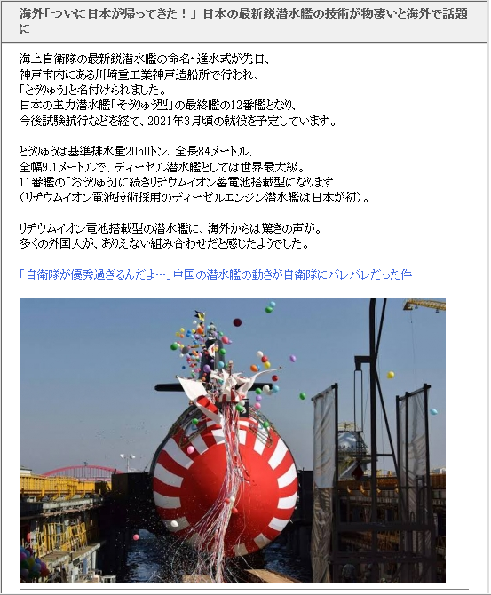 そうりゅう型の最終艦だとすると、すでに新しい型式の潜水艦が予定されているのかな?>とうりゅうは基準排水量2050トン、全長84メートル、