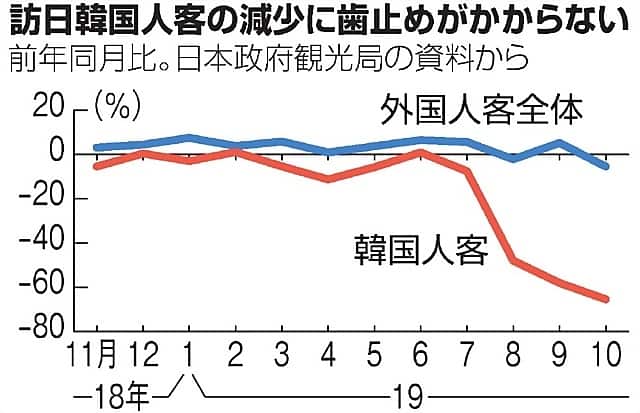 韓国人旅行者が急減したきっかけは、日本政府が7月4日に発動した半導体関連3品目の対韓輸出規制の強化だ。韓国で訪日旅行を控える動きが急速に広がり、8月は前年同月比で48・0%減と半分になった。ソースぐらい貼れよ