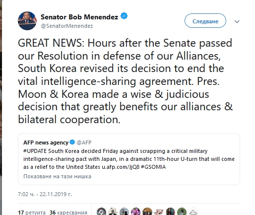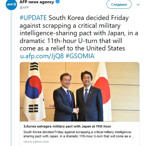 ヘリテージ財団のブリースクリムナー上級研究員のTwitterは内容的には「文大統領が国民感情よりも安全保障を優先したことを評価する。日本も対話だけしないで理に合わない輸出規制を中断しなければならない」とあります