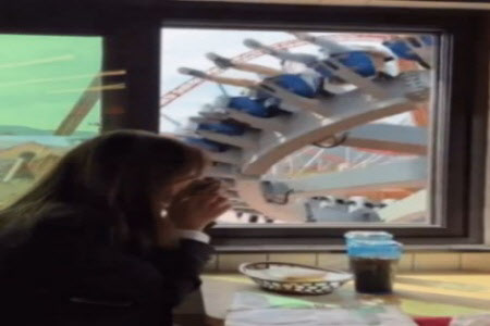 この場面は、ある客が食堂の窓際で食事をしている間に撮影された映像だ。公開された映像を見ると、アトラクションが窓をかすめるように回転しながら通り過ぎる。窓の外のアトラクションに向かって手を振っていた客は、この姿を不思議そうに眺めている。