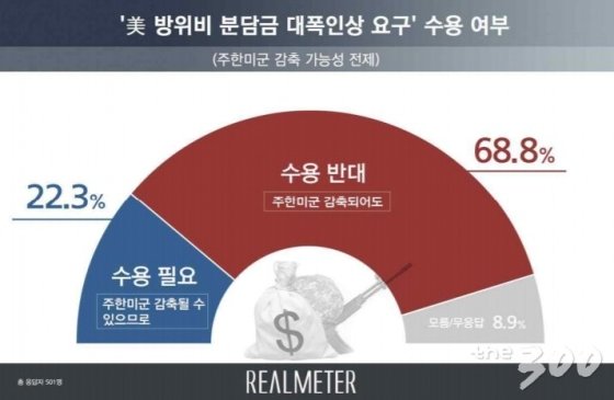 >世論調査専門機関リアルメーターがYTN「ノ・ジョンミョンのよりニュース」の依頼で調査発表した結果だ。在韓米軍削減の可能性を前提に、米国の防衛費分担金大幅引き上げ要求を受け入れるかどうかを調査したところ、在韓米軍が削減されても受け入れてはならない」という反対の応答が68.8%と集計された。
