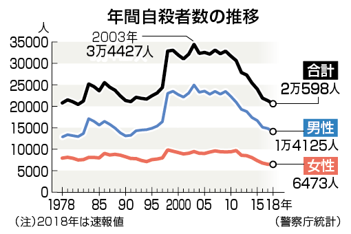 日帝の蛮行と称して捏造した虐殺写真を幼少期から大量に見せられた子供は死を身近なことと考え、挫折や困難に対する耐性が低く自殺と言う逃避行動に移りやすい。>>6日本も2000年代初期の頃、自殺率が非常に高かった。今は、年々縮小傾向になってきた。